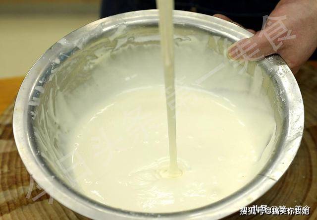 ,左三圈右三圈地搅匀,一直朝一个方向搅拌面糊容易上劲,调至脆皮糊呈流水状即可,不要有面疙瘩。