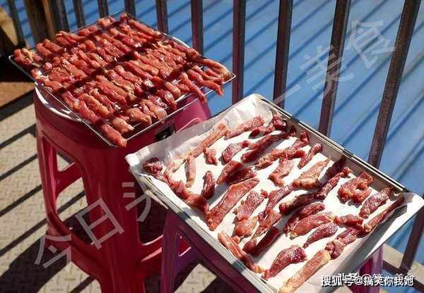 腌好以后把肉条逐个摆在肉架或者烤盘上面,放到有阳光的地方晒个