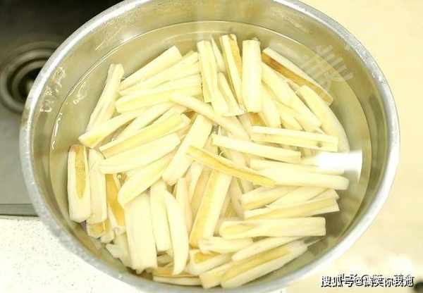 ,把外皮削干净,削好以后切成均匀的粗条 用清水淘洗干净,再换水泡上以免氧化变黑。