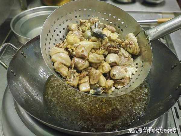 锅里多烧一点油,油温五成热的时候倒入鸡块,利用热油瞬间收紧鸡皮。