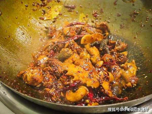 先把姜粒炒一下,再放香料一块炸香,然后把鸡块倒进去颠锅翻炒吸收姜粒和大料的香味,鸡块煸香以后把