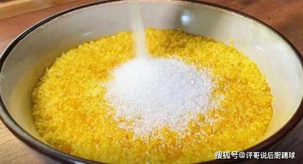 3、煮熟的小黄米中同样放入一些砂糖,搅拌均匀,如果大家不喜欢吃太甜的话,砂糖可以放少一些。