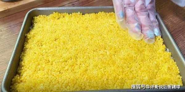 6、继续在糯米表面铺上一层小黄米,同样压实平整表面。
