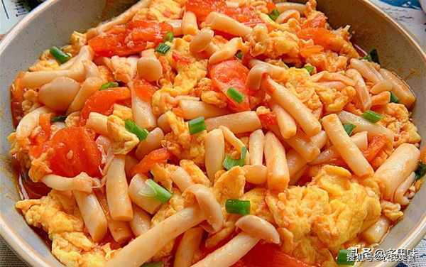 4、锅中再放少许油,放番茄炒出番茄汁,放入海鲜菇,放鸡蛋,放适量的盐,放一勺蚝油,翻炒均匀,放胡椒粉,撒上香葱即可出锅。里面的汤汁泡饭也很好吃哦!
