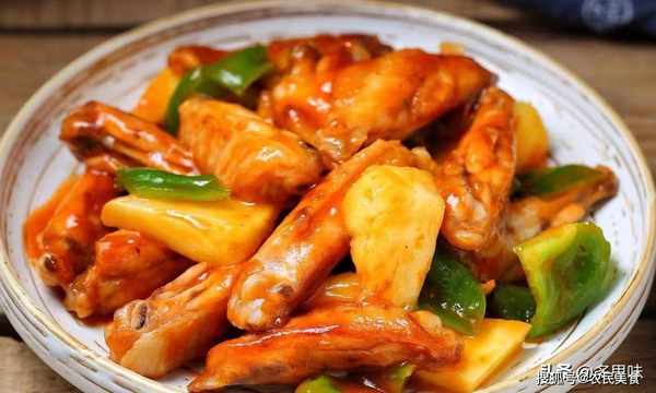 食材:鸡翅中8个 菠萝150克 青椒1/2个 葱1根 姜3-4片 蚝油1大勺