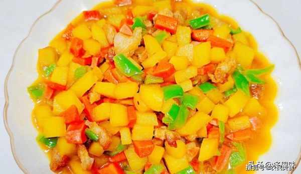 3、加入适量清水闷煮2分钟左右加入青椒炒至断生就可以出锅啦!一道色香味俱全的五彩肉末土豆丁就做好啦!特别入味下饭,真是老少皆宜的一道家常菜。