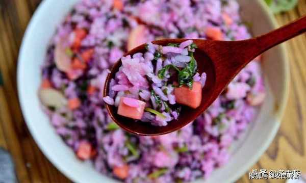 材料:红苋菜80克、米饭一碗、火腿肠1根、大蒜5瓣、盐二克