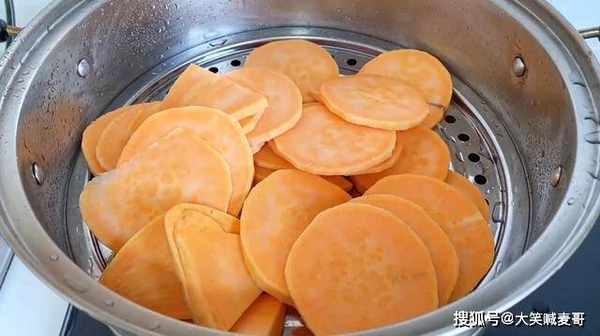 1、首先将红薯切薄片,隔水上锅蒸熟。?
