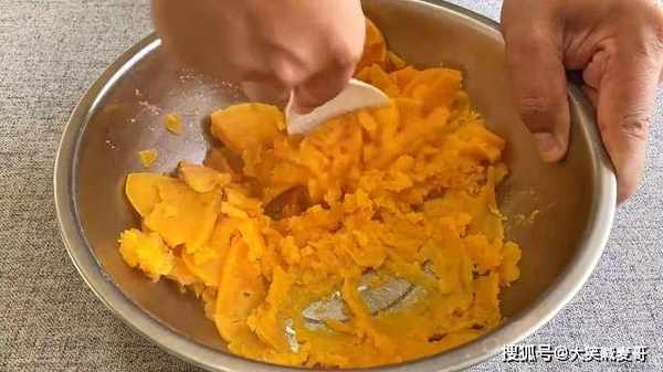 2、接着将蒸熟的红薯放碗中,将它碾碎成红薯泥。