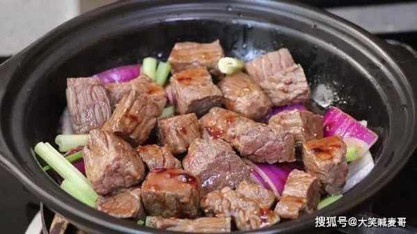 5.将炒好的牛肉粒放入砂锅中,淋上调好的料汁,盖上锅盖,让它咕嘟10分钟即可。