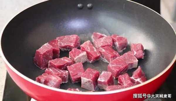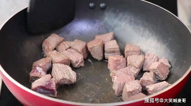 2.起锅放牛肉,不用放油,就这样干煸2分钟,炒至变色后盛出备用。