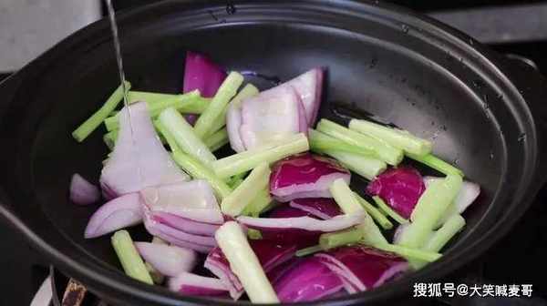 3.芹菜梗切段,洋葱切块,全部切好铺在砂锅底部备用。