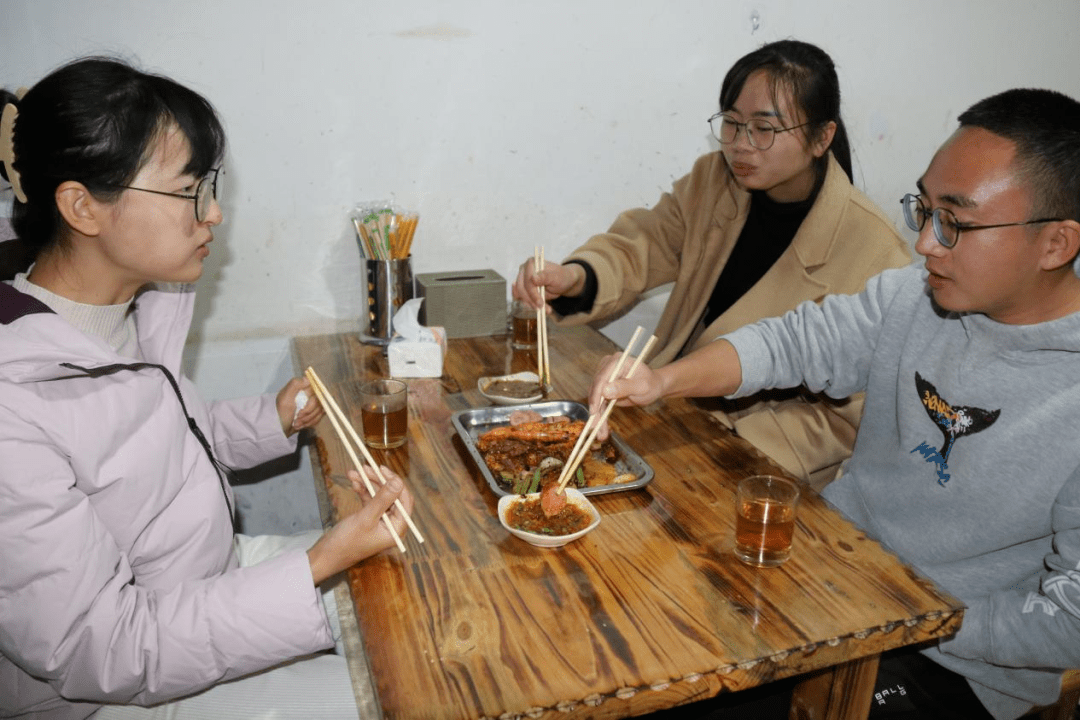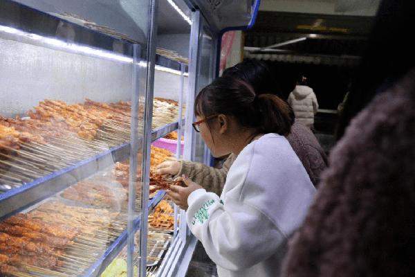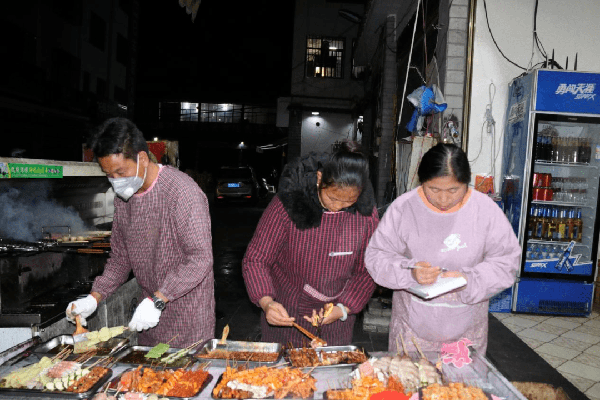 店里比较受欢迎的有烤肉肠、炒螺蛳、烤鱼、烤毛肚、烤牛皮、烤茄子、特制拌面和砂锅炖豆腐……来的顾客都想尝一尝。一般深夜12点关门,但是也有生意火爆到夜里一两点才下班的,而且遇到节假日的时候可能需要排队或提前预订。