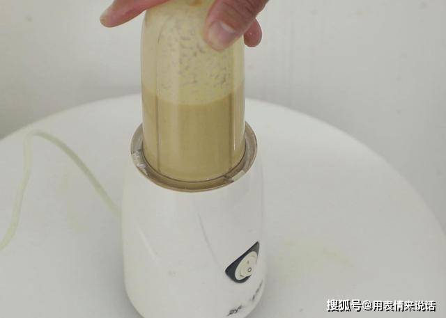 3.把晾凉的芝麻 放入榨汁杯中进行打磨。打磨过程中可以把榨汁杯取下来摇晃几下,方便芝麻完全打碎。