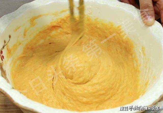 蒸熟以后取出来放入盆中,加入白糖10克增加南瓜的甜度,用勺子按压成南瓜泥,打入两个鸡蛋搅拌均匀,温度稍凉一点倒入酵母3克搅拌化开,加入普通面粉,面粉要分次添加,用筷子搅成比较粘稠的糊状,盖住发酵1个小时。