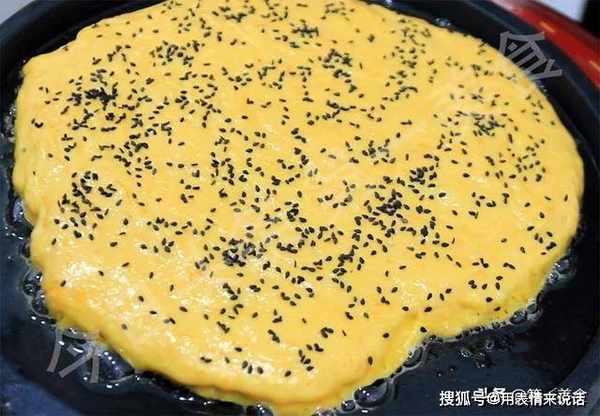 把电饼铛先通电加热,锅热以后用小刷子刷上一层植物油,把发酵好的南瓜糊全部倒在电饼铛内,用锅铲把南瓜糊铺平、摊圆,撒上黑芝麻,盖上锅盖煎1分钟。