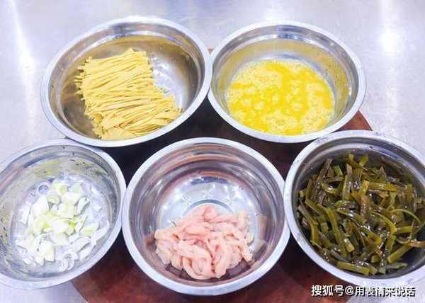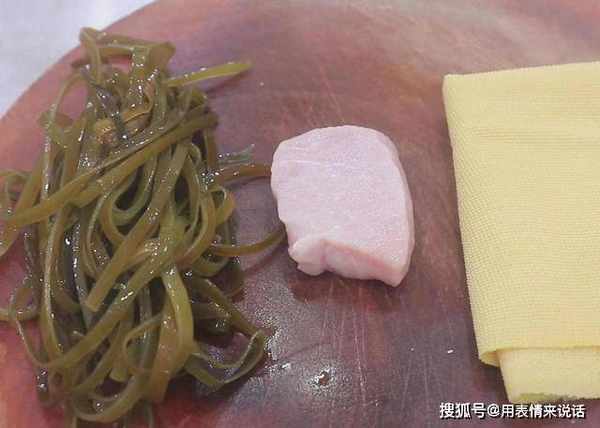 1.切点肉丝,豆腐皮两张, 划开以后叠放在一起 ,切成豆腐丝。海带一把 ,长的剪短点,放在清水里把盐分淘洗干净。