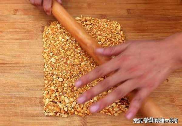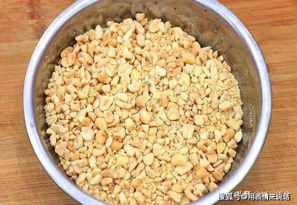 晾凉以后把花生皮搓掉,放到保鲜袋中用擀面杖敲成花生碎备用。花生不用擀得太碎,有点颗粒感,吃着更加香脆。