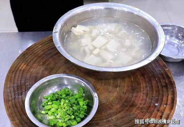 老豆腐一块,切成片放入清水中浸泡一会儿,再切一点葱花备用。
