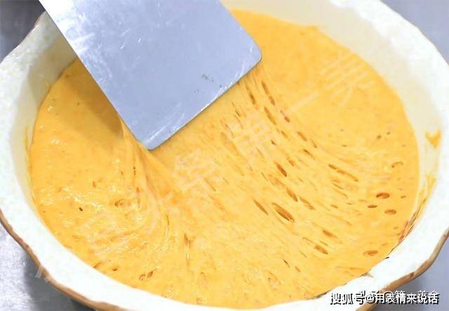 1个小时以后南瓜糊已经发酵成满满一面盆,用锅铲扒一下能看得出里面全是蜂窝眼。