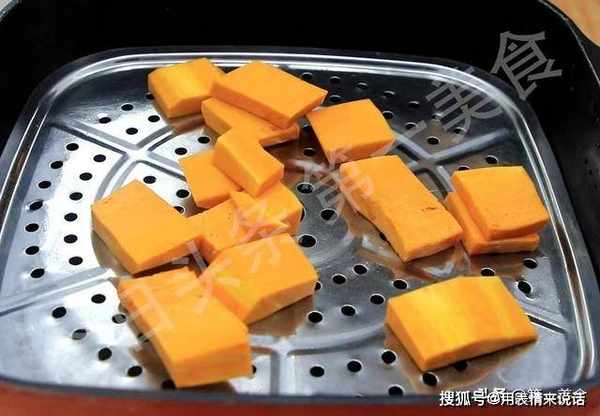 准备南瓜一小块,削去外皮,切成小片放入蒸锅内,蒸8分钟就可以了。