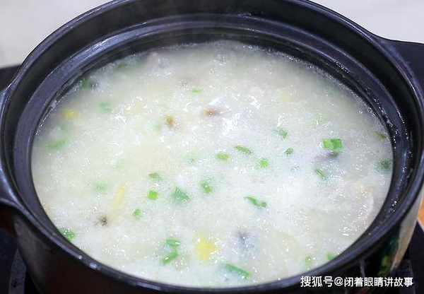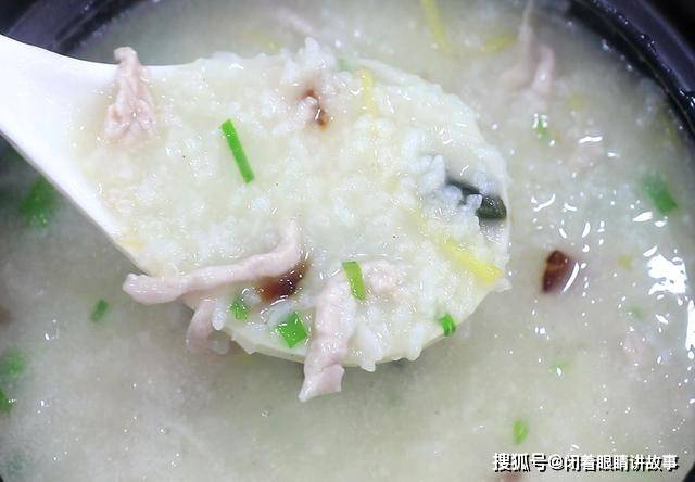 6.1个小时以后大米已经完全爆花,放入姜丝和皮蛋,搅拌均匀再煮5分钟,挖起一勺米粥,加入食盐2克、胡椒粉2克、鸡精2克、少许料酒,把调料搅匀再重新倒入锅中,调料直接下锅的话容易凝结成块,最后放入肉丝,煮至肉丝定型变色即可关火,再撒入葱花。