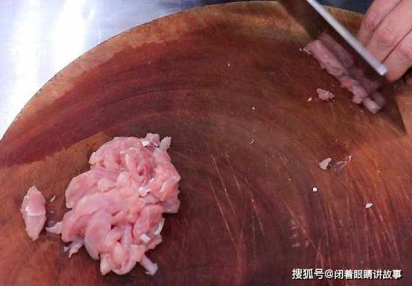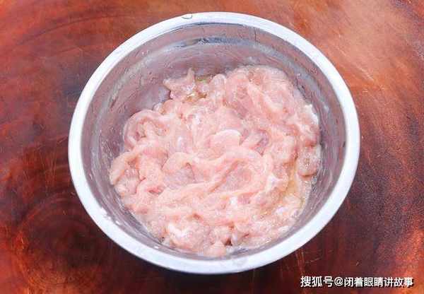 3.准备猪瘦肉一小块,先平刀片成薄片,再顺着纹理切成肉丝放入盆中。
