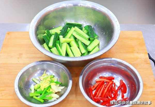 1.准备两根黄瓜,清洗干净后去除两头,切成黄瓜条放入盆中,加入两勺食盐,用手抓匀腌制30分钟。再切点蒜片、小葱段、姜片、红椒丝备用。