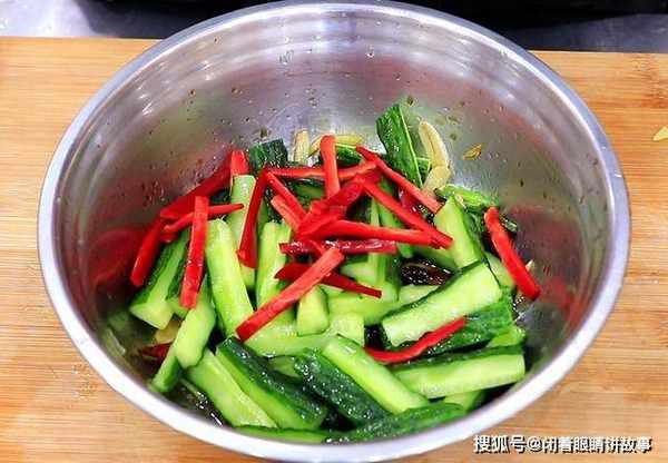 3.30分钟以后使劲挤压出黄瓜中的水分,把黄瓜放到准备好的料碗中,放入红椒丝,颠盆拌匀后即可装盘。