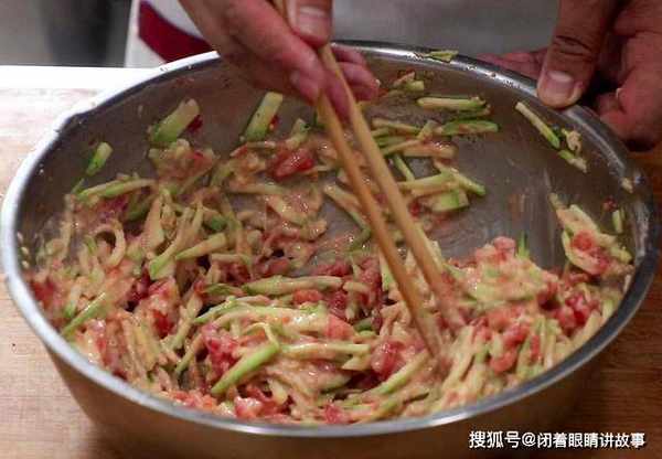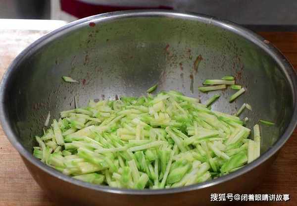 2准备西葫芦一个,洗干净以后切掉两头,先切成薄片再切成细丝,和番茄放在一起,加入食盐2克,多搅拌一会儿杀出西葫芦中的水分,以免烙制的时候出水。