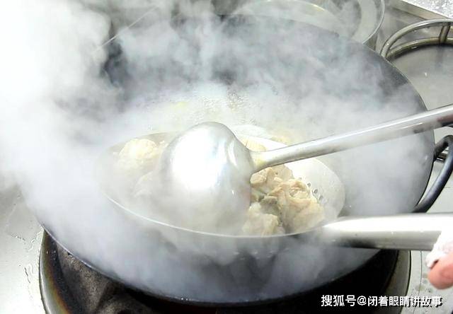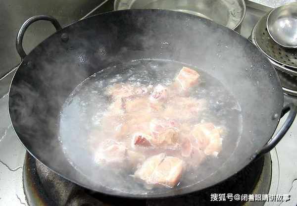 3.锅内加烧,把骨头控干净血水放入凉水锅中,加入一点食盐入底味,倒入料酒10克,水烧开以后沿锅边打去浮沫,大约煮2分钟,把排骨倒出来用清水冲洗干净,控水备用。