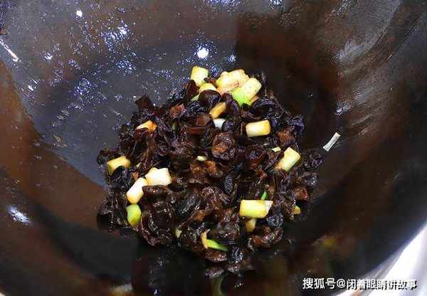 3.锅内烧油,油烧热以后倒入葱段,开小火慢慢煸炒,大葱煸香、煸成金黄色,把木耳倒入锅中翻炒均匀,勾入一点水淀粉,让调料更好地吸附在食材上面,再加一些明油提亮色泽,翻匀后即可出锅。