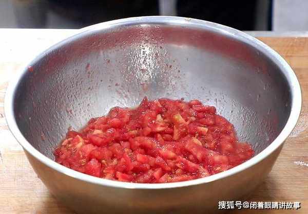 1.准备番茄一个,打上十字花刀放入开水中烫1分钟,番茄烫软以后捞出来,把外皮剥掉切成番茄丁备用。