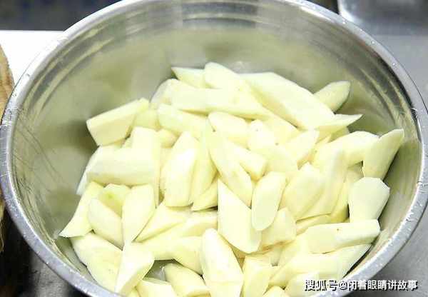 2.准备几根山药,把外皮削干净,削好以后放入清水中洗干净,切成均匀的滚刀块放入盆中,用清水泡上以免氧化变黑。再切一点姜片和大葱段备用。