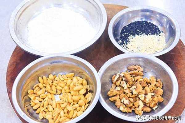 准备普通面粉500克,适量的黑白芝麻、核桃仁和花生米,把核桃和花生米放入石臼子你捣碎。
