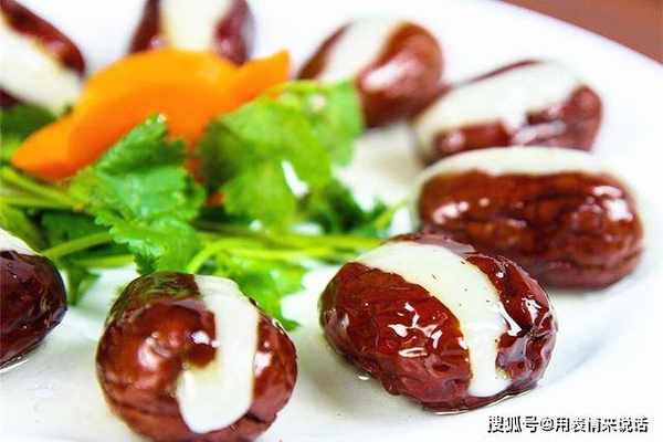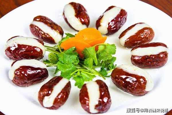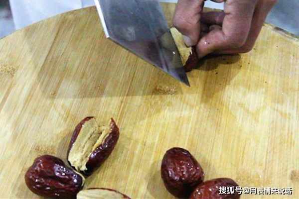 红枣浸泡10分钟洗干净,沿一侧划开、剔除枣核。