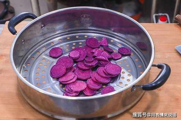 紫薯削净外皮,切成均匀薄片,放入锅中蒸15分钟,蒸熟以后取出来,压成红薯泥。