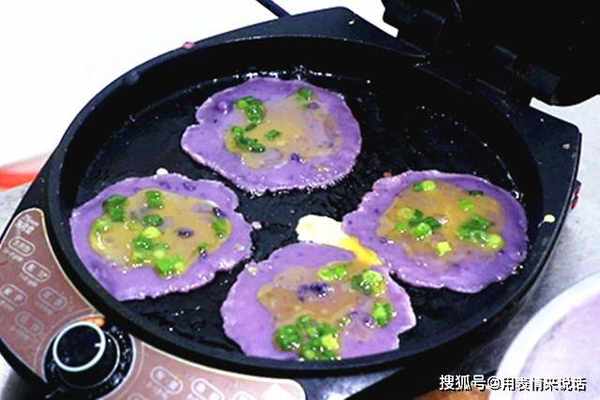 电饼铛烧热,均匀淋上植物油,把紫薯面糊舀进去,摊成圆形的小饼,盖上锅盖烙一分钟,面糊定型以后在上面抹上一层蛋液,然后盖上锅盖再烙一分钟。