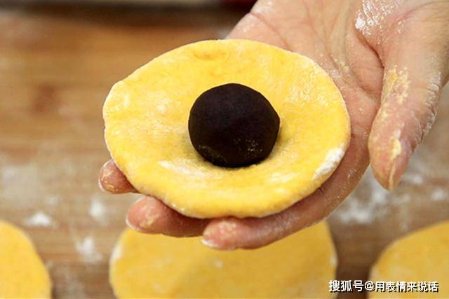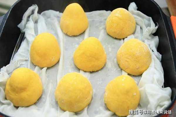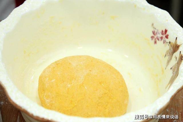 然后在南瓜泥中加入酵母3克,放入适量的面粉揉成团发酵一个小时。