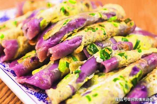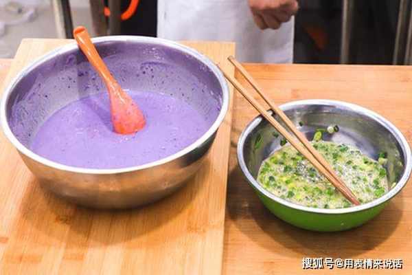 然后在紫薯泥中打入一个鸡蛋搅拌均匀,加入适量的面粉,用清水调成酸奶稀稠度的面糊。另外准备3个鸡蛋,加入食盐1克,放入适量葱花,搅拌打散成蛋液备用。