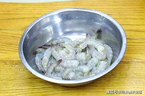 准备鲜虾500克,去除虾头、虾壳,保留最后一节和虾尾,用牙签挑出虾线后洗干净,加入食盐、胡椒粉、鸡粉、料酒,抓拌均匀腌制10分钟。