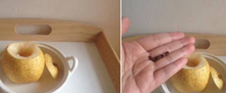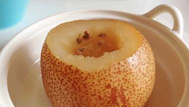 制作方法:梨一个,洗净,横断切开挖去中间核后,放入花椒,冰糖,再把梨对拼好放入碗中,上锅蒸半小时左右即可,一个梨可分两次吃完。