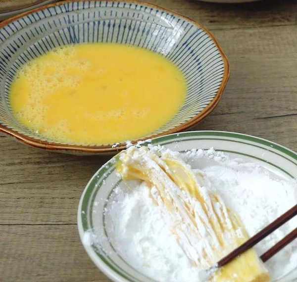 准备好玉米淀粉,然后食材裹上一层蛋液,一层玉米淀粉。