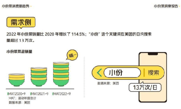 2022年,“小份”这个关键词在美团的日均搜索量超过13万次,小份菜已成为商家和用户的共同选择。