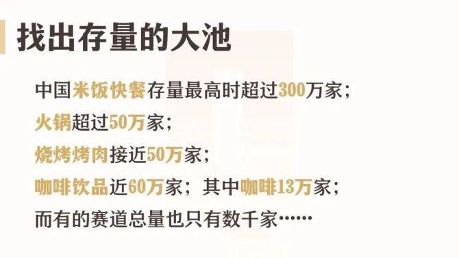 选品就是找出存量的大池,类似于米饭快餐赛道,存量最高时超过300万家,这样的规模能够承载起万店连锁。