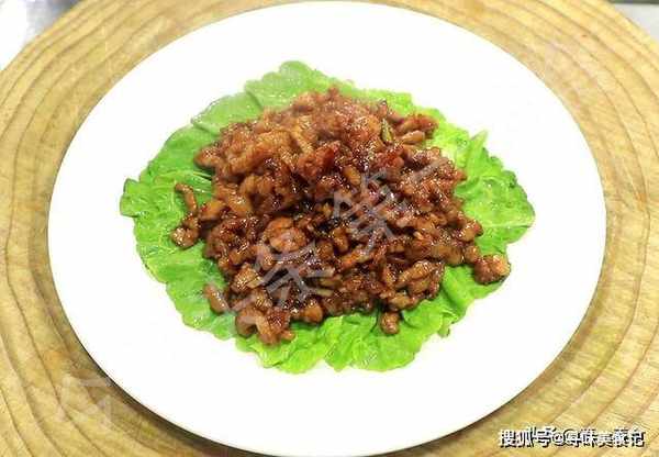 提亮色泽,翻炒均匀以后即可出锅,盘底铺两片生菜叶,把肉丝放在上面备用。
