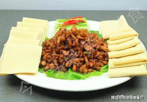 入底味,水烧开以后把豆腐皮放入锅中,焯水30秒钟,豆腐皮变软以后捞出来,快速用清水冲洗几下,控干水分,叠成均匀小块摆放在盘中,再放上葱丝、青红椒丝点缀一下,一道酱香浓郁的京酱肉丝就做好了。