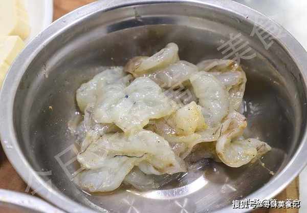 ,去掉虾头,剥掉虾壳,在大虾的背上划一刀,把虾线挑出来,放入清水中洗干净,控干水分备用。