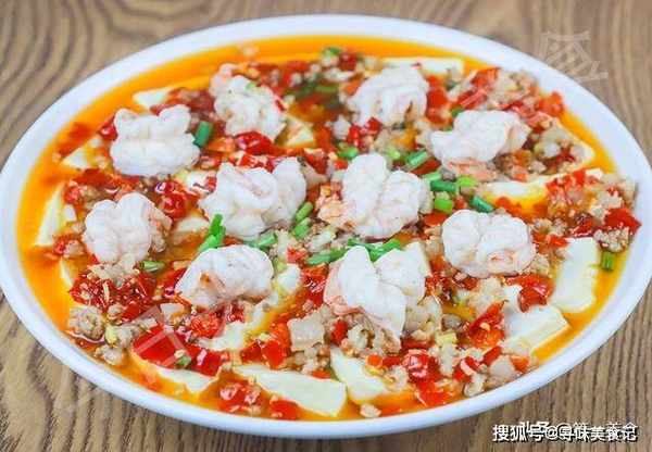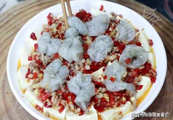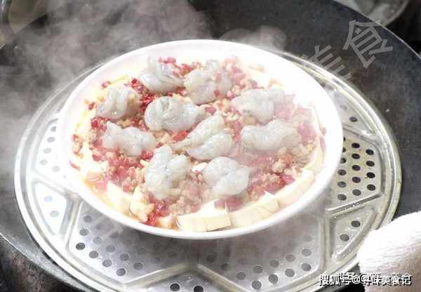 ,翻炒均匀后起锅,把酱料均匀浇在豆腐上,再摆上腌好的虾仁备用。