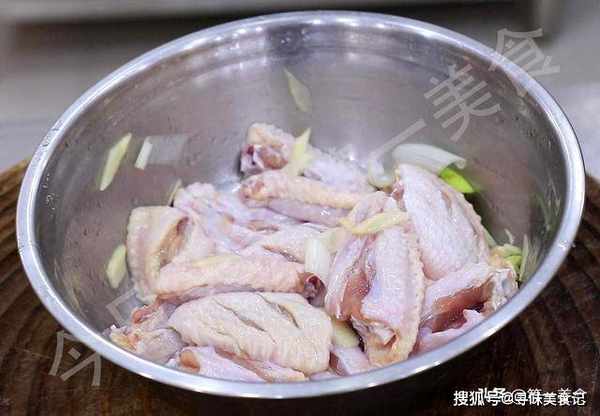 切点葱粒、姜片和鸡翅放在一起,倒入
